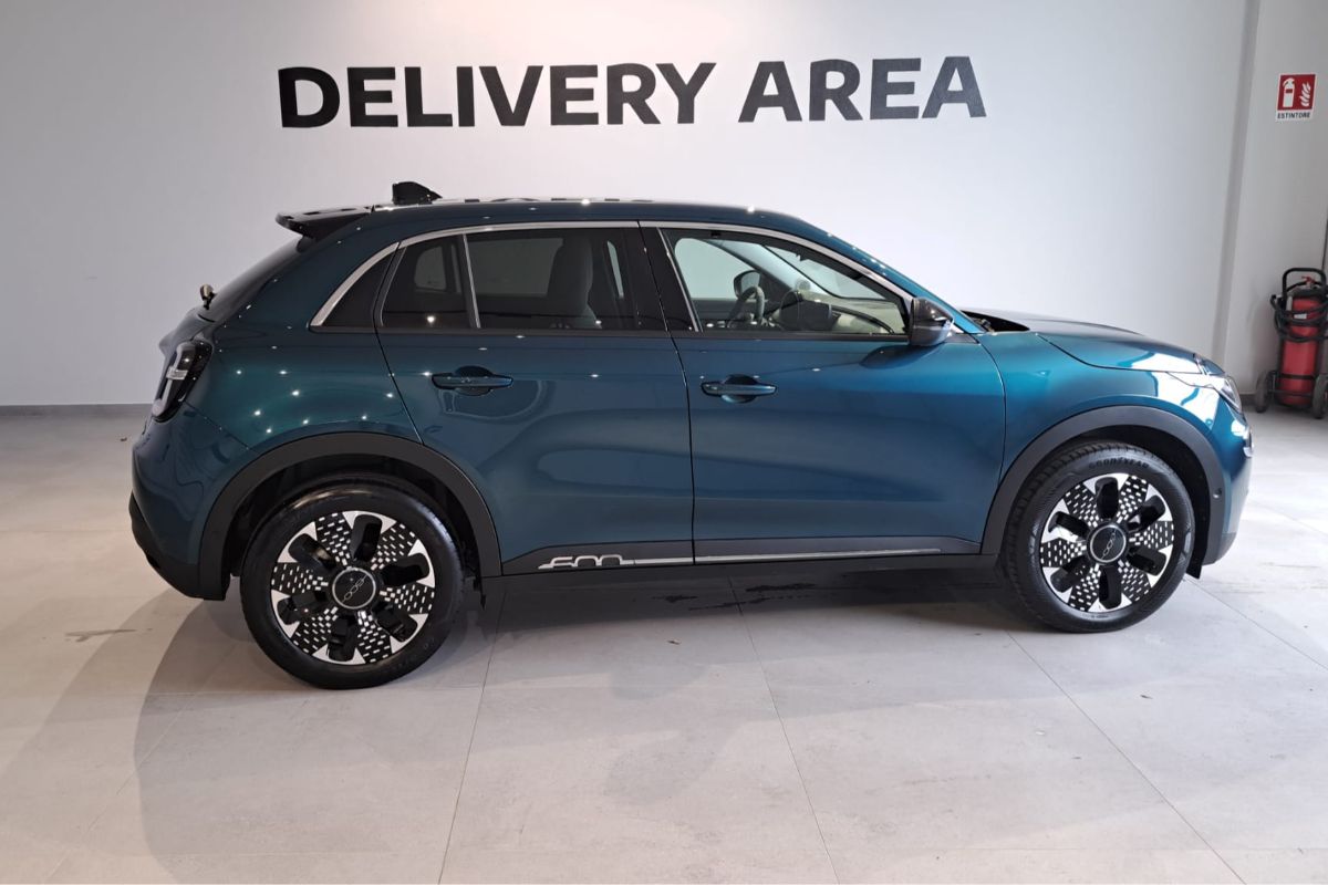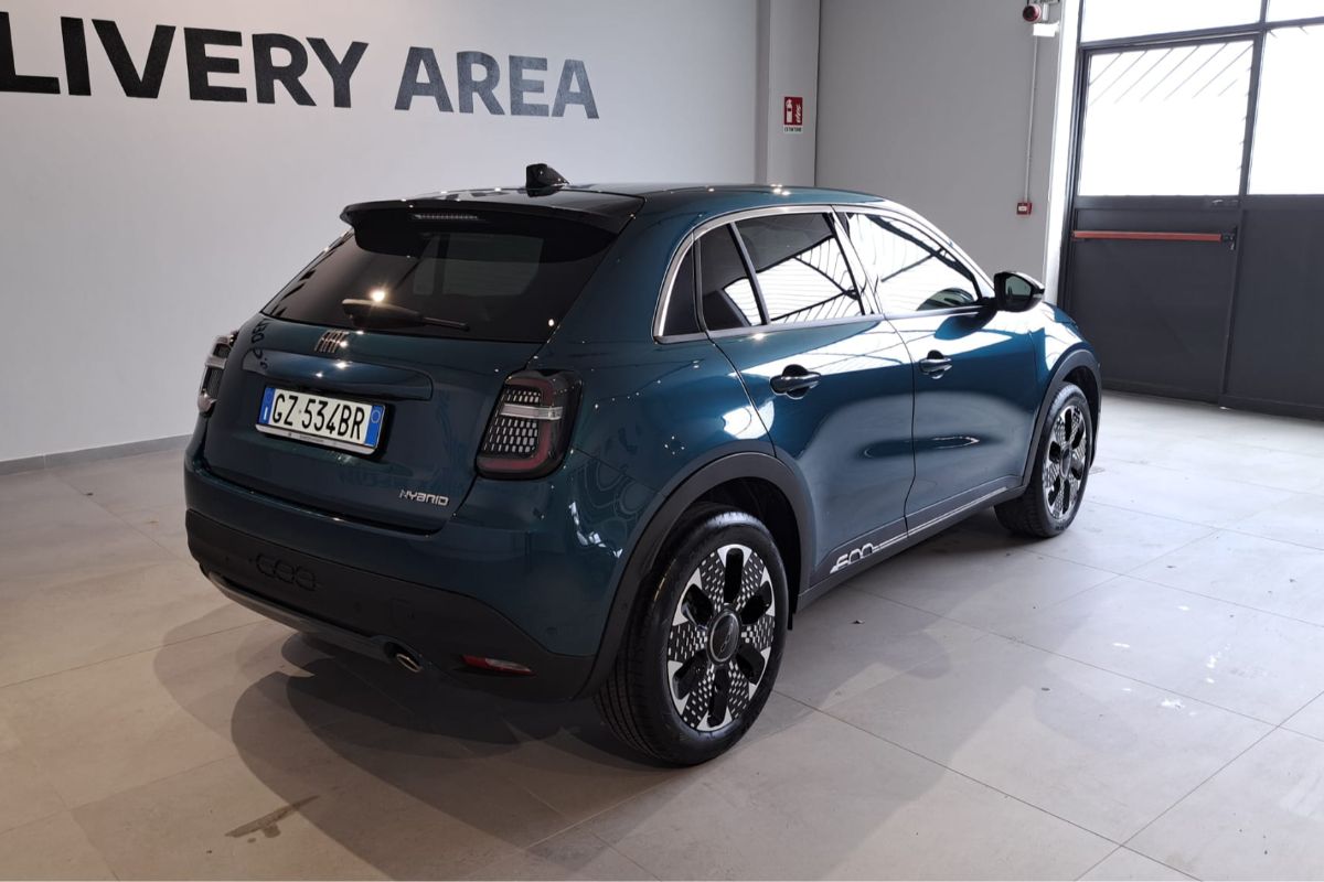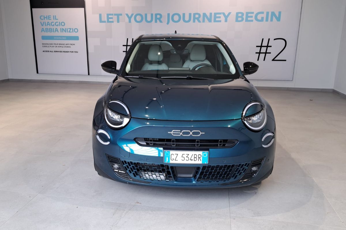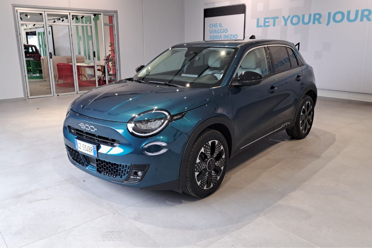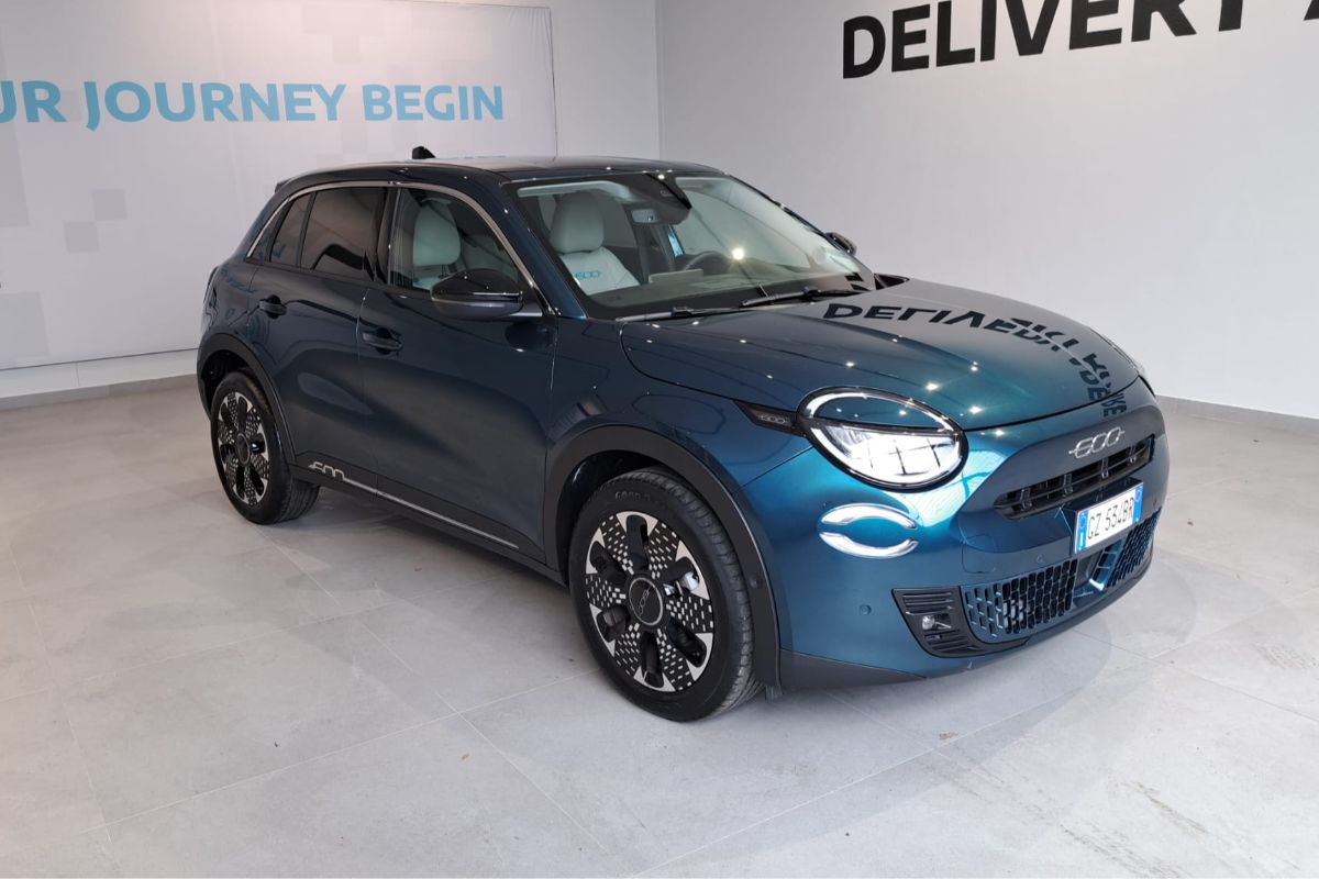 Fiat 600 1.2 Hybrid 110Cv La Prima, immatricolata 03/2025, km 18.760, colore Verde Mare Metallizzato, interni in pelle avorio.