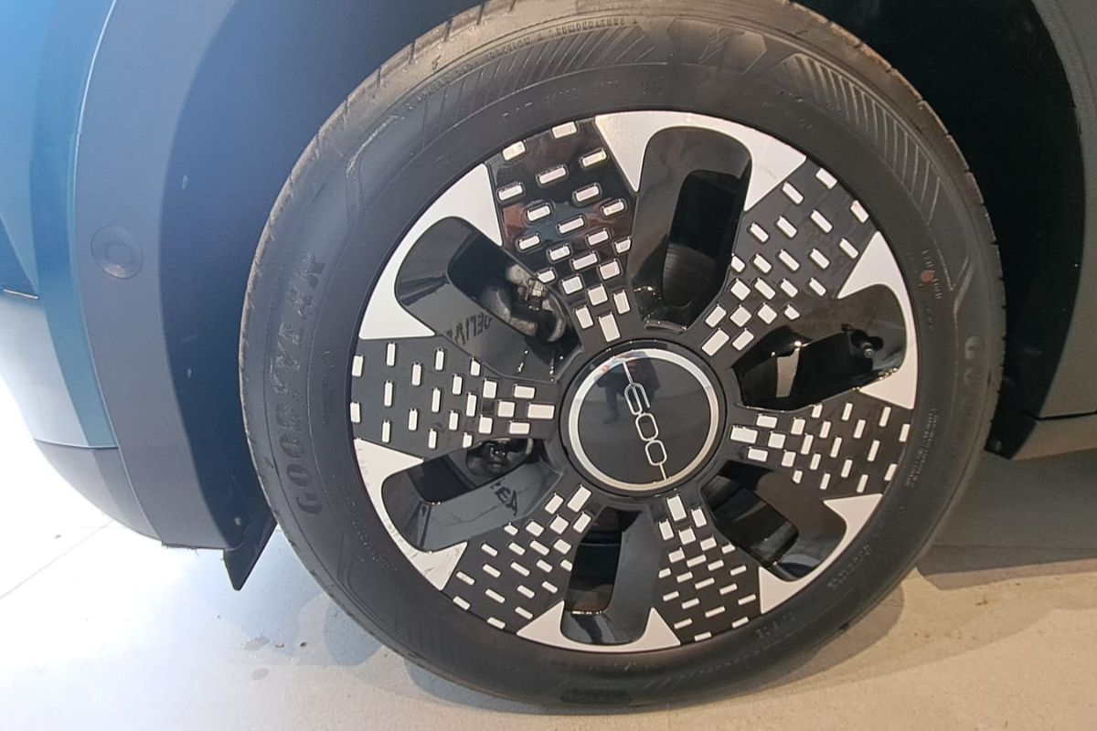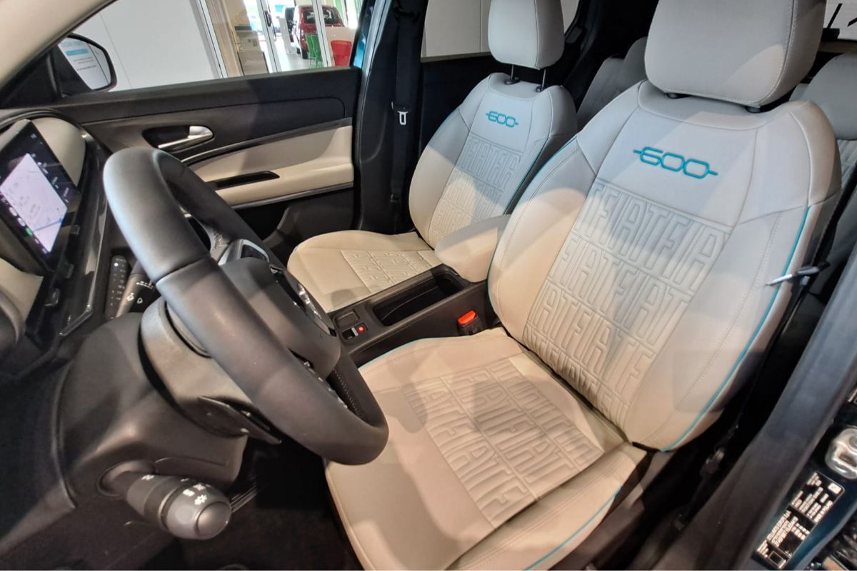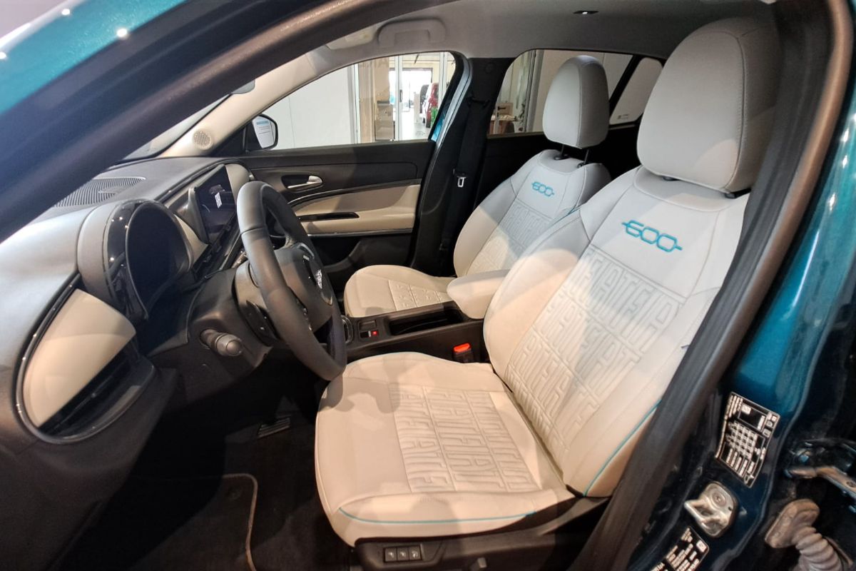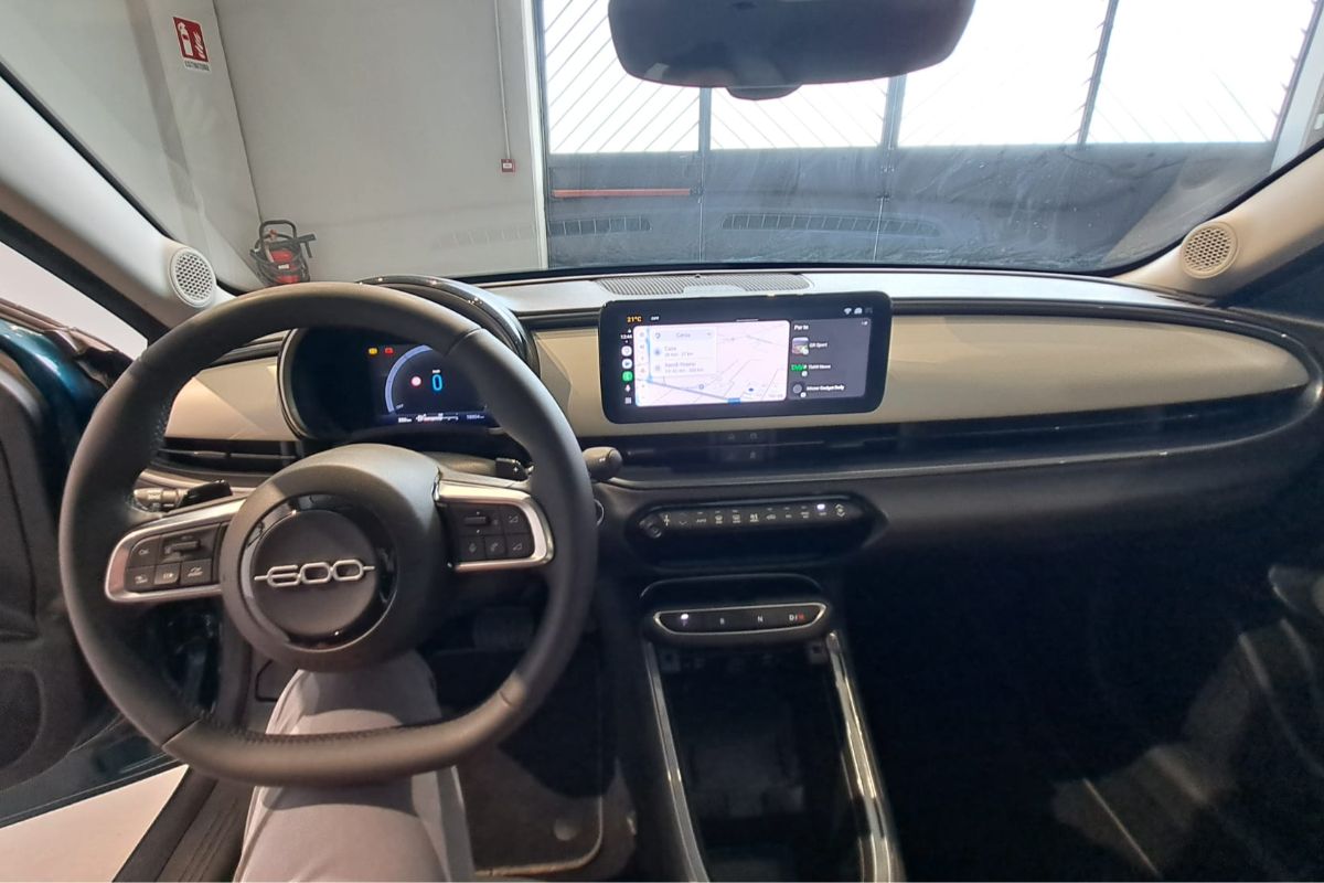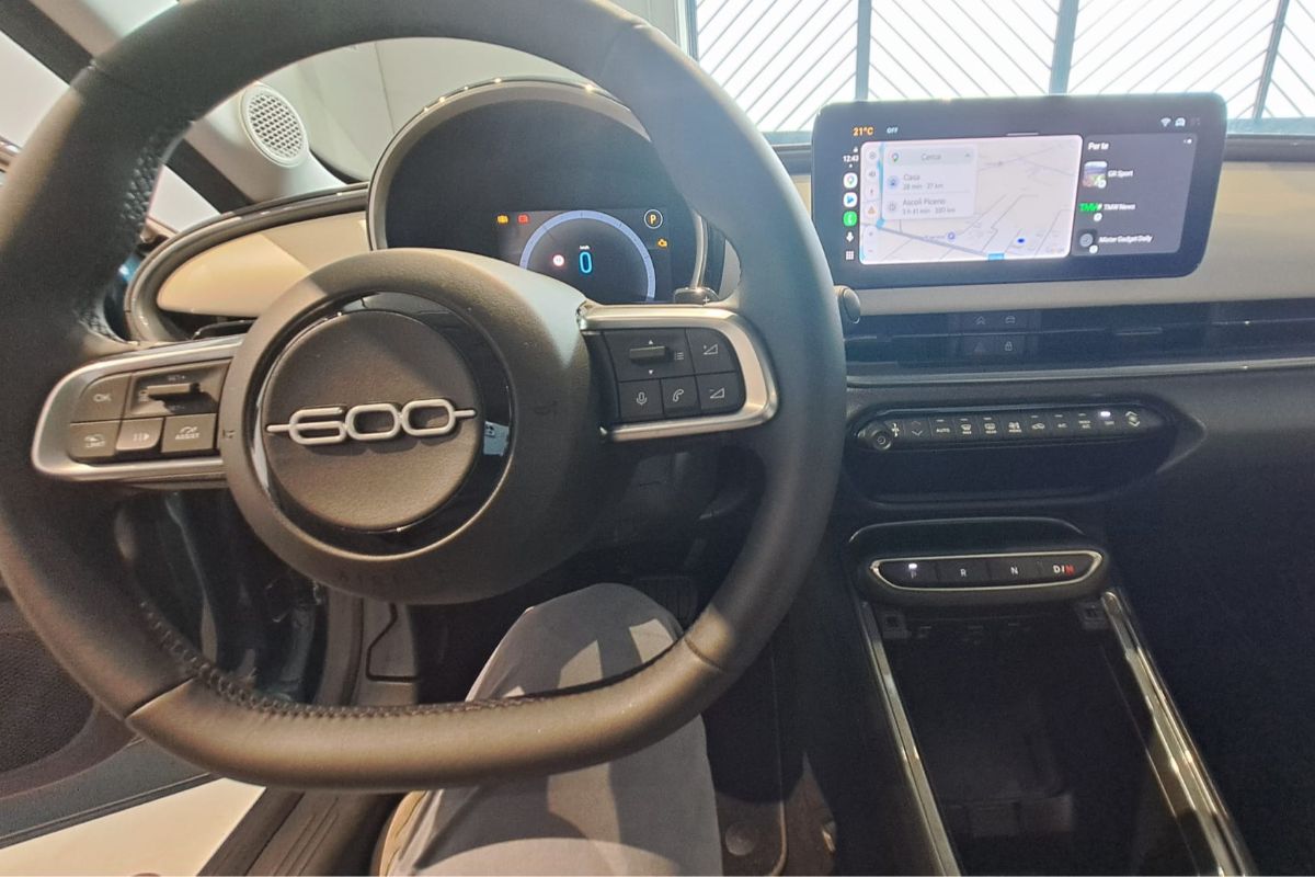 Fiat 600 1.2 Hybrid 110Cv La Prima, immatricolata 03/2025, km 18.760, colore Verde Mare Metallizzato, interni in pelle avorio.