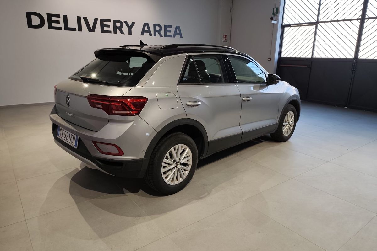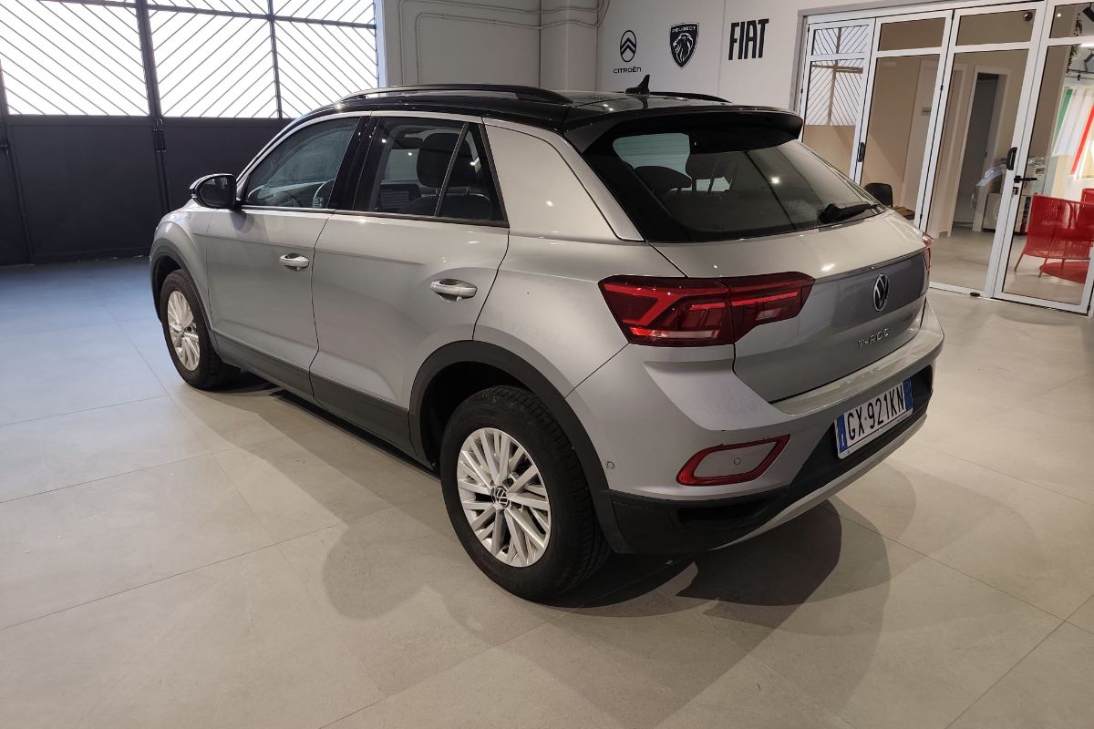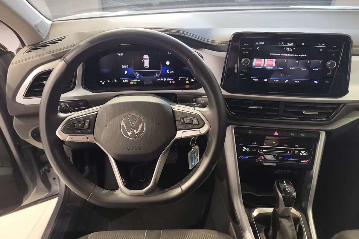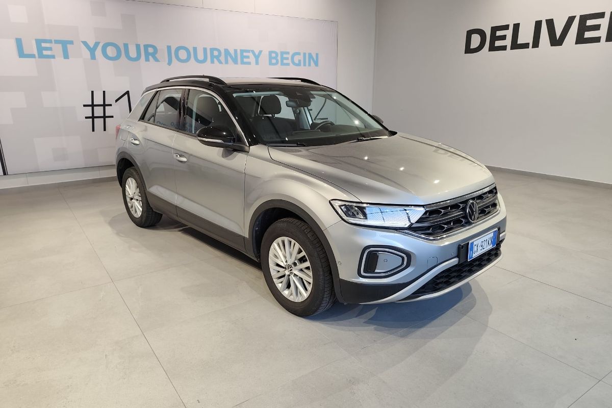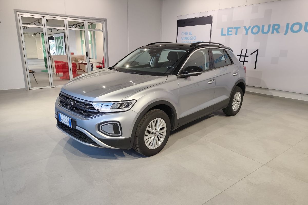 Volkswagen T-Roc 1.5 ACT 150Cv DSG Life, immatricolato 11/2024, km 24.860, colore Pyrit Silver con Tetto Nero, interni in tessuto.